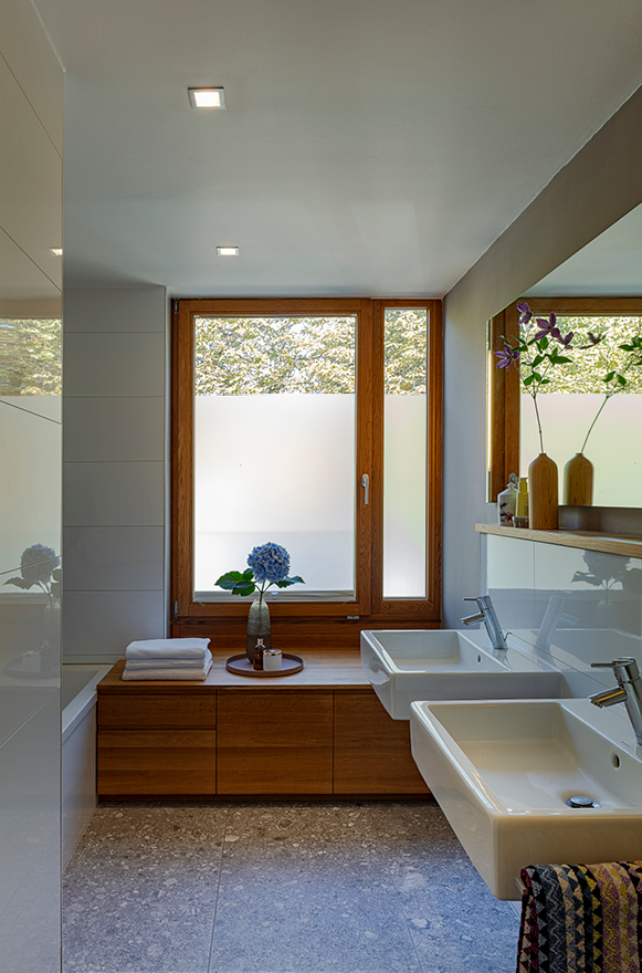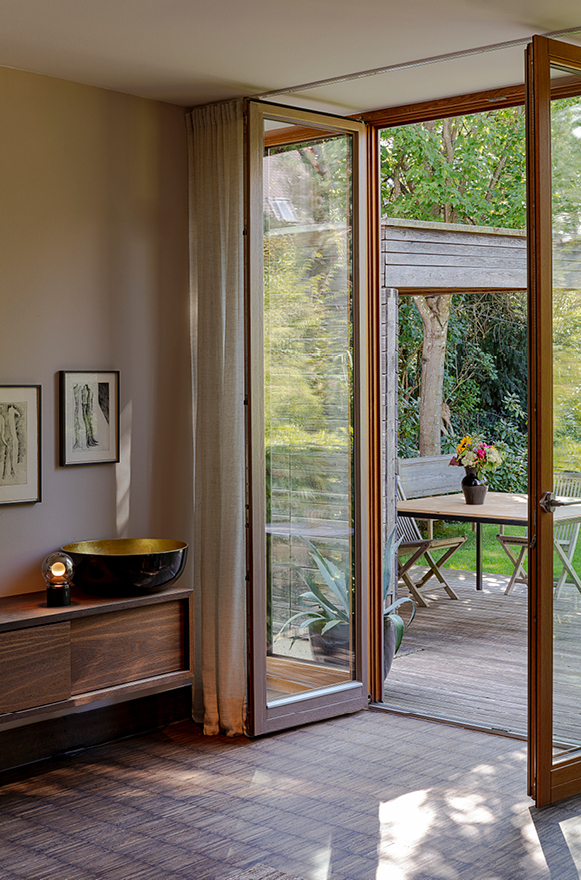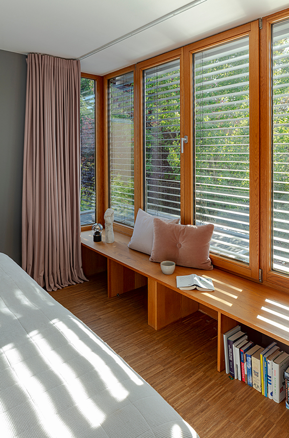 Das Sitzfenster öffnet den Blick in den Garten und schafft so einen behaglichen Ort zum Sinnieren und Lesen.